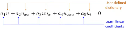 \(\underbrace{ \left[ \begin{array}{c c c c} u(p_1) & u_{x x}(p_1) & u(p_1)u_x(p_1)& u_{x x x}(p_1) & u_t(p_1) \\\ \vdots & \vdots & \vdots & \vdots & \vdots \\\ u(p_k) & u_{x x}(p_k) & u(p_k)u_x(p_k) & u_{x x x}(p_k) & u_t(p_k) \end{array} \right] }_{\mathcal{M}_u(p)} \left[ \begin{array}{c} a_1 \\\ \vdots \\\ a_5 \end{array} \right]=0\)